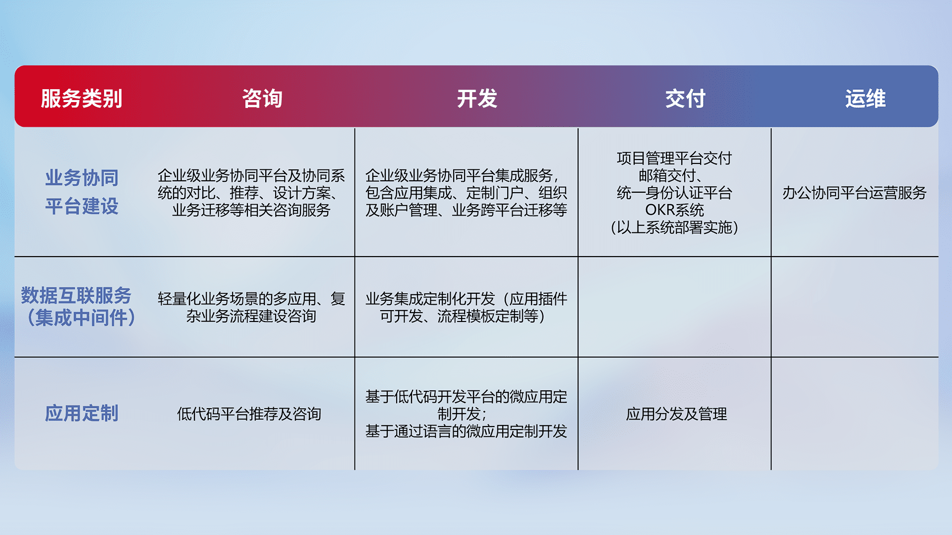 针对钉钉、、、、企微、、IDaas等平台级产品提供产品的规划、、方案、、、交付、、、定制化开发等服务,,实现如统一协同办公、、、智能客户服务、、、、混合会议管理、、、智能数据查询、、、等业务场景,,,,实现数字化转型。。。。