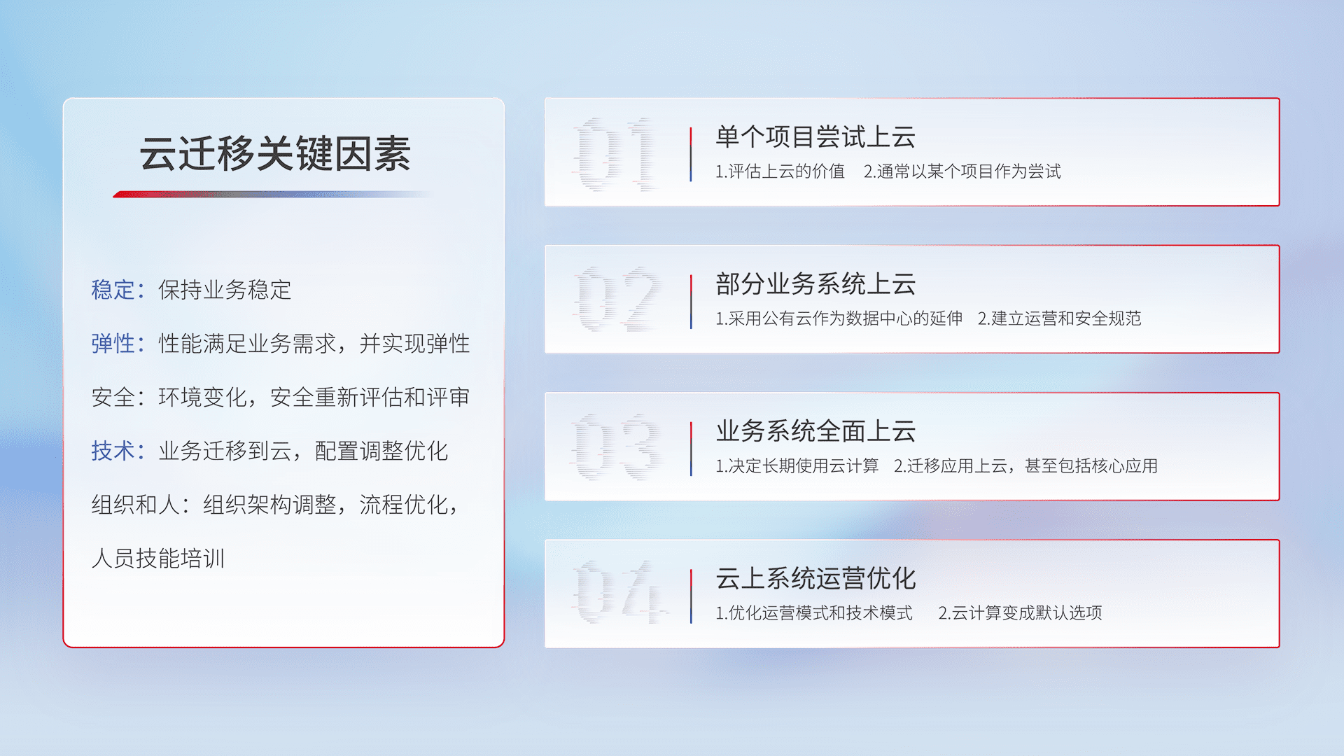 结合实际业务,,从规划设计、、云平台选型、、、、云原生改造、、数据迁移、、集成交付,,,迁移全过程为客户识别最佳上云路径,,,,做好风险识别管理,,,设计网络架构、、、身份权限、、安全审计合规、、、、操作审计、、、日志审计、、、、监控告警策略、、、、多站点容灾设计等,,,,对云上基础设施进行整体规划,,,,提升IT治理水平,,以满足弹性、、、、高可用、、高性能的需求。。。。